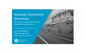 April 25, 2023, 1 p.m. CST - Gateway Community Workshop Webinar Gateway communities will play a key role in developing infrastructure around national parks. To support gateway communities and towns surrounding national parks,