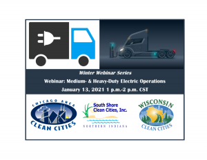 January 13, 2021, 1 p.m.-2 p.m. CST - Winter Webinar Series: Medium- & Heavy-Duty Electric Operations Webinar Join Drive Clean Indiana, Wisconsin Clean Cities & Chicago Area Clean Cities for